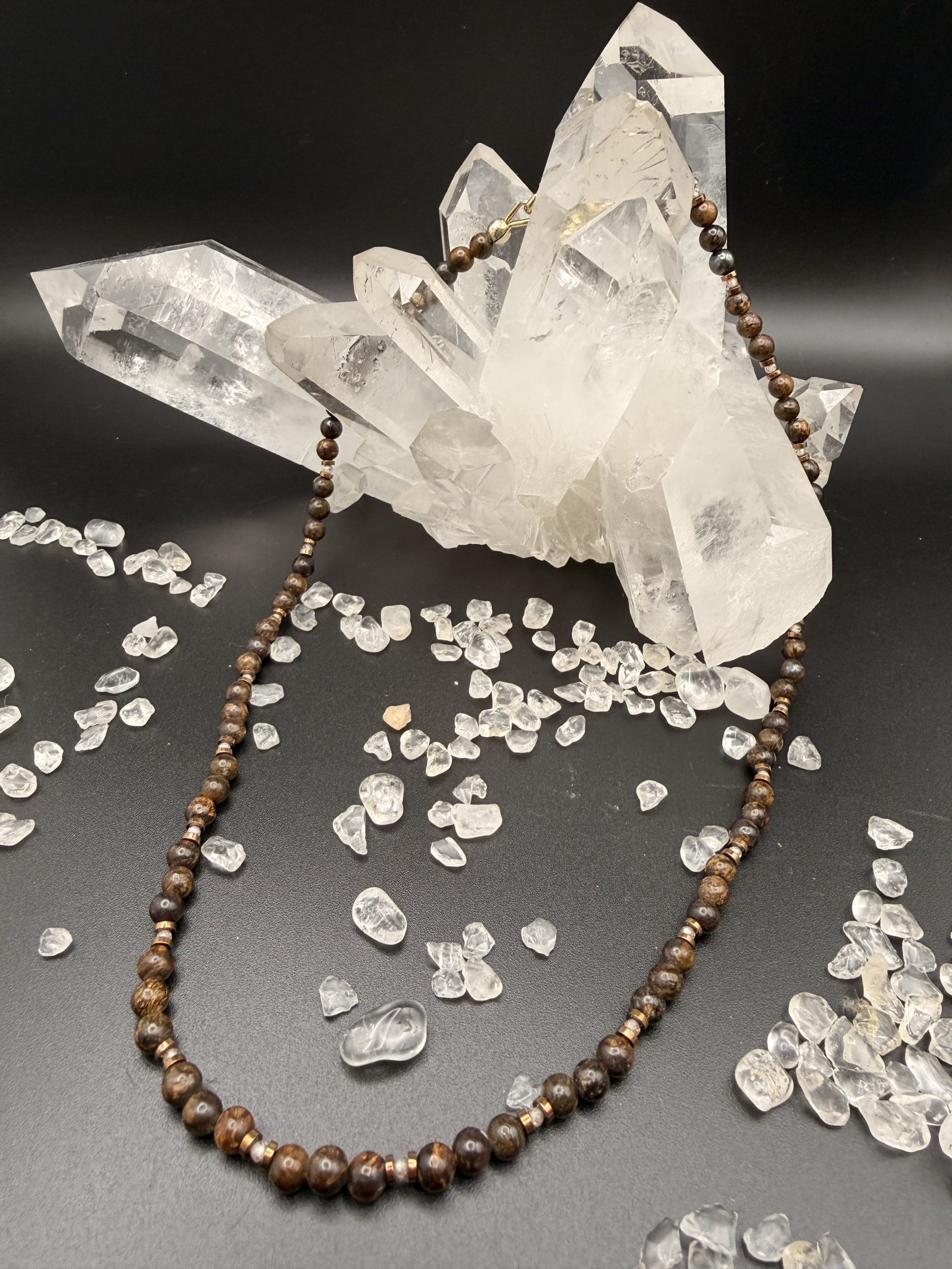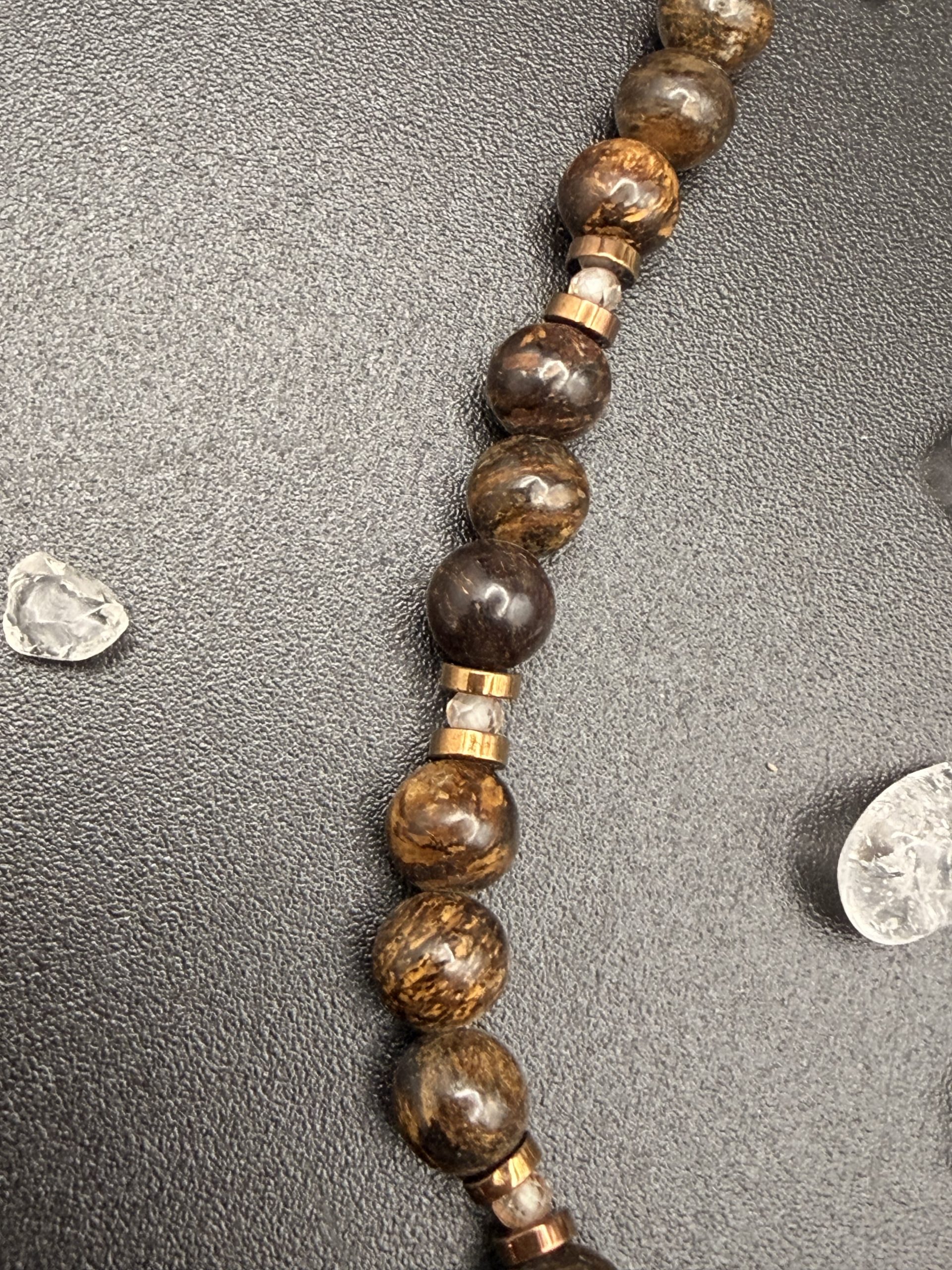 Diese, in liebevoller Handarbeit, gefertigte Edelsteinkette vereint die warme Eleganz von Bronzit mit der feinen Brillanz von Zirkon und den klaren Akzenten von Hämatit.