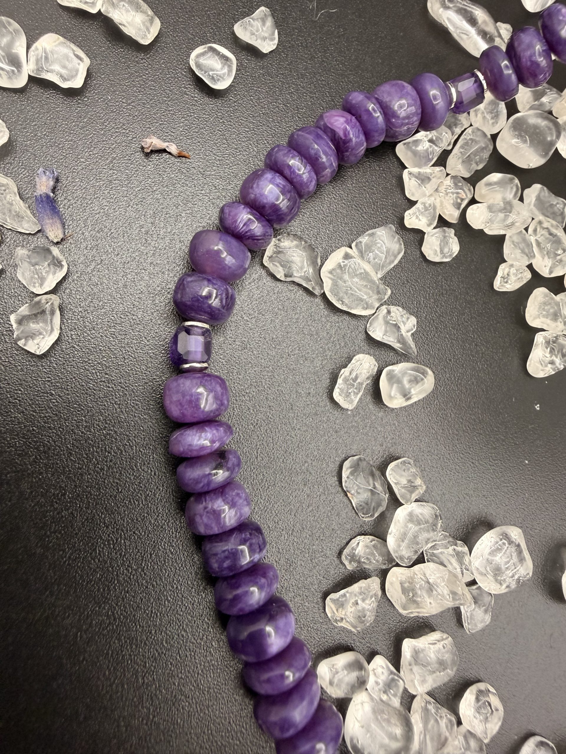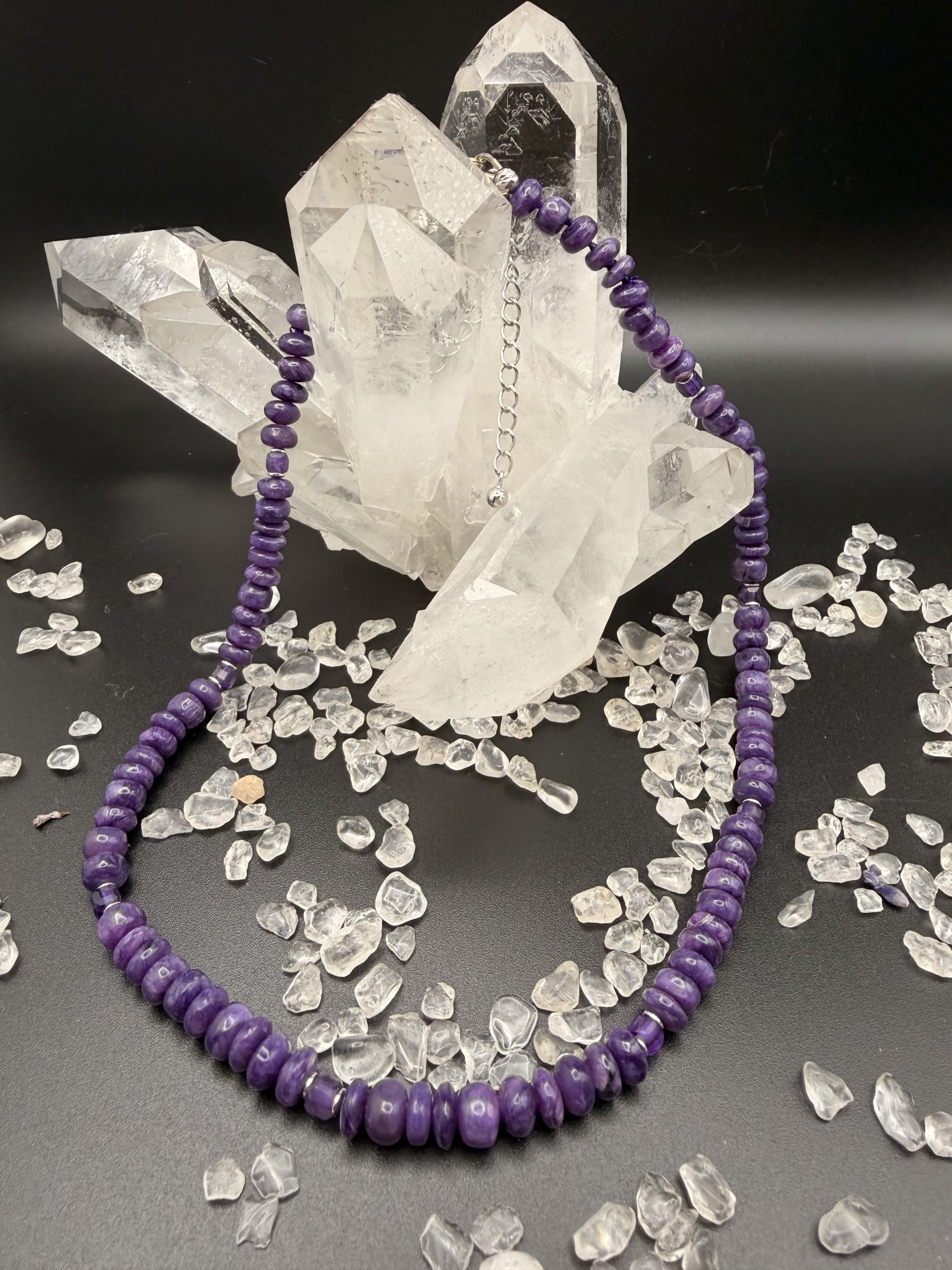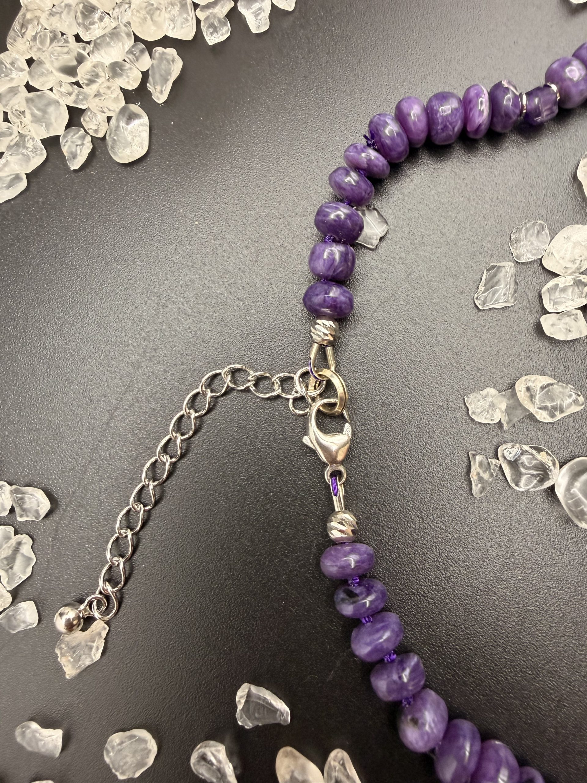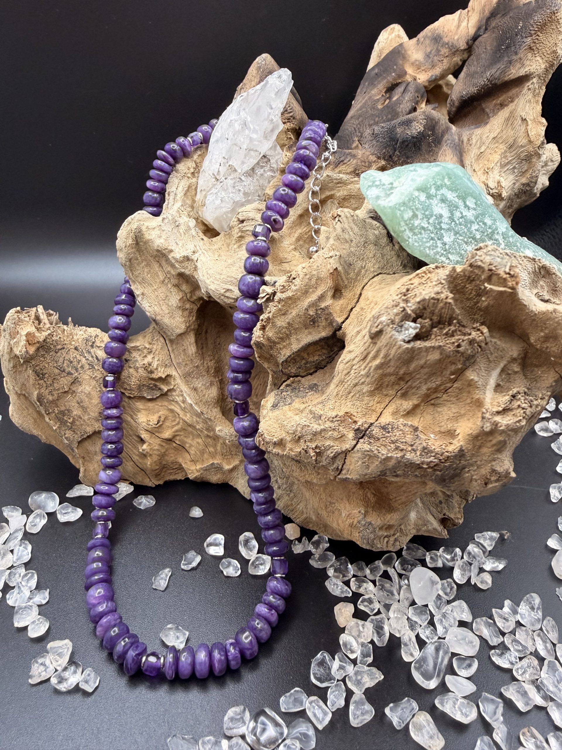 Diese edle Halskette vereint die faszinierende Schönheit des seltenen Charoits mit der sanften Ausstrahlung des Amethysts. Der Charoit ist bekannt für seine charakteristische violette Maserung und schimmernde Nuancen. Er steht für Transformation und innere Stärke. Ergänzt wird er durch den Amethyst, der Ruhe, Klarheit und spirituelle Balance symbolisiert.